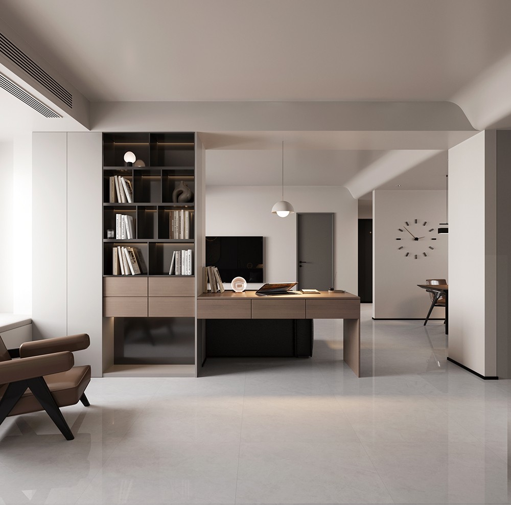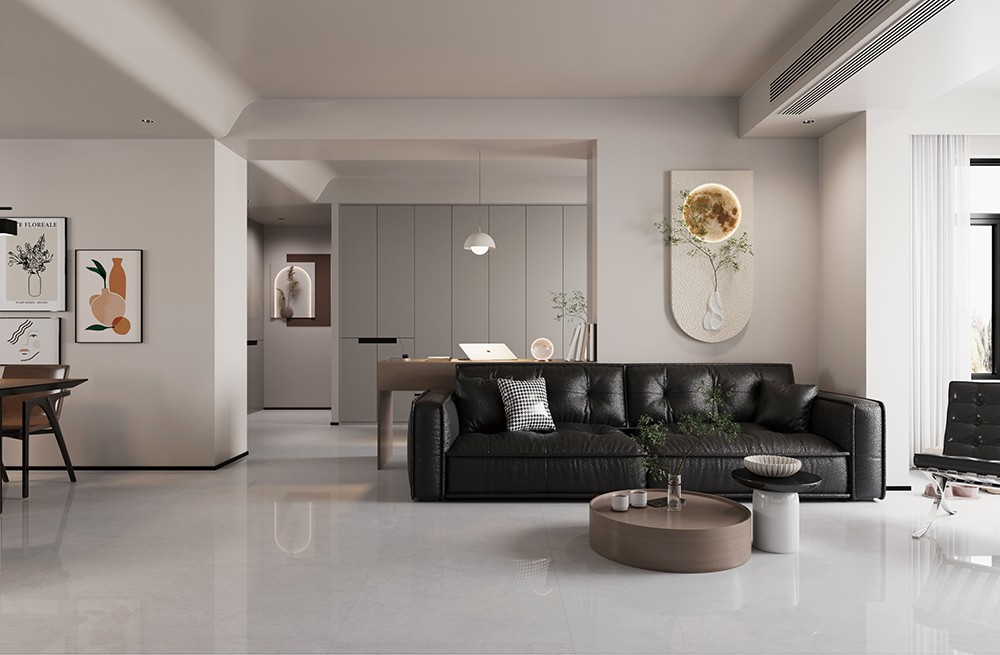以灰白為底色,巧妙地利用淺灰色線條在磚面上勾勒出縱橫交錯的紋理,仿佛山脈延綿的自然曲線,既流暢又充滿韻律感。