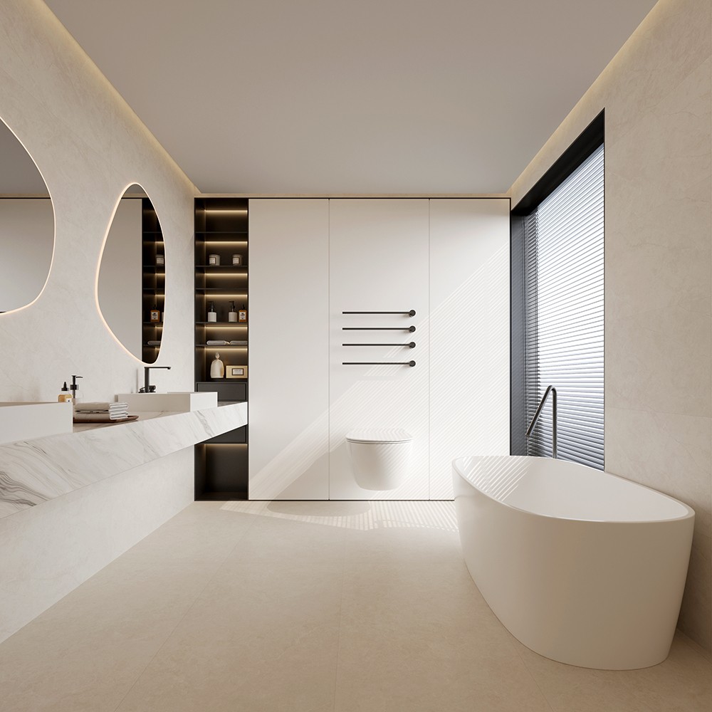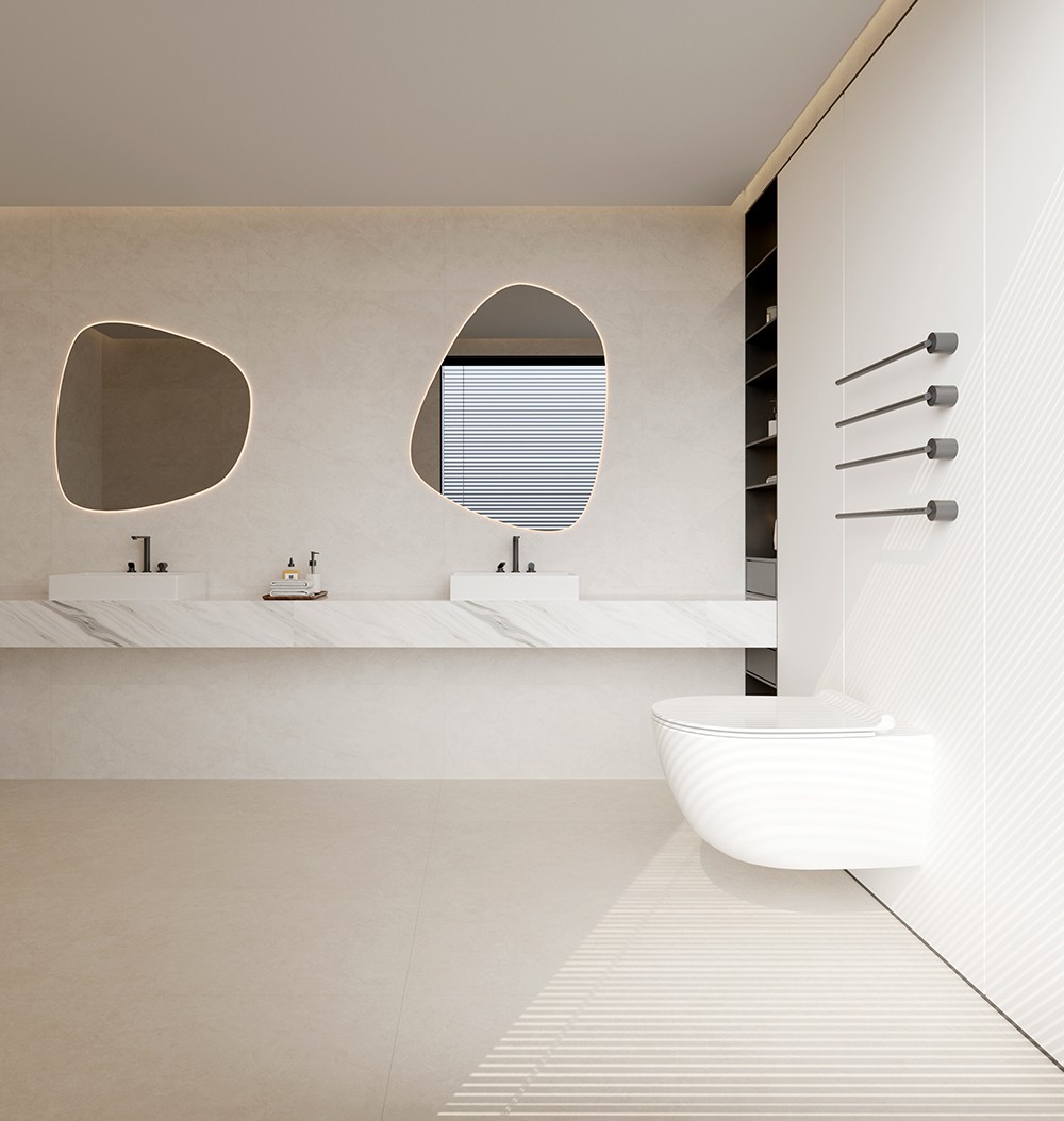 以灰白為底色,巧妙地利用淺灰色線條在磚面上勾勒出縱橫交錯的紋理,仿佛山脈延綿的自然曲線,既流暢又充滿韻律感。
